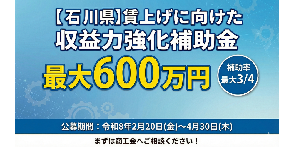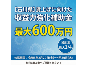 【石川県】「賃上げに向けた収益力強化補助金」公募開始のお知らせ(上限600万円)