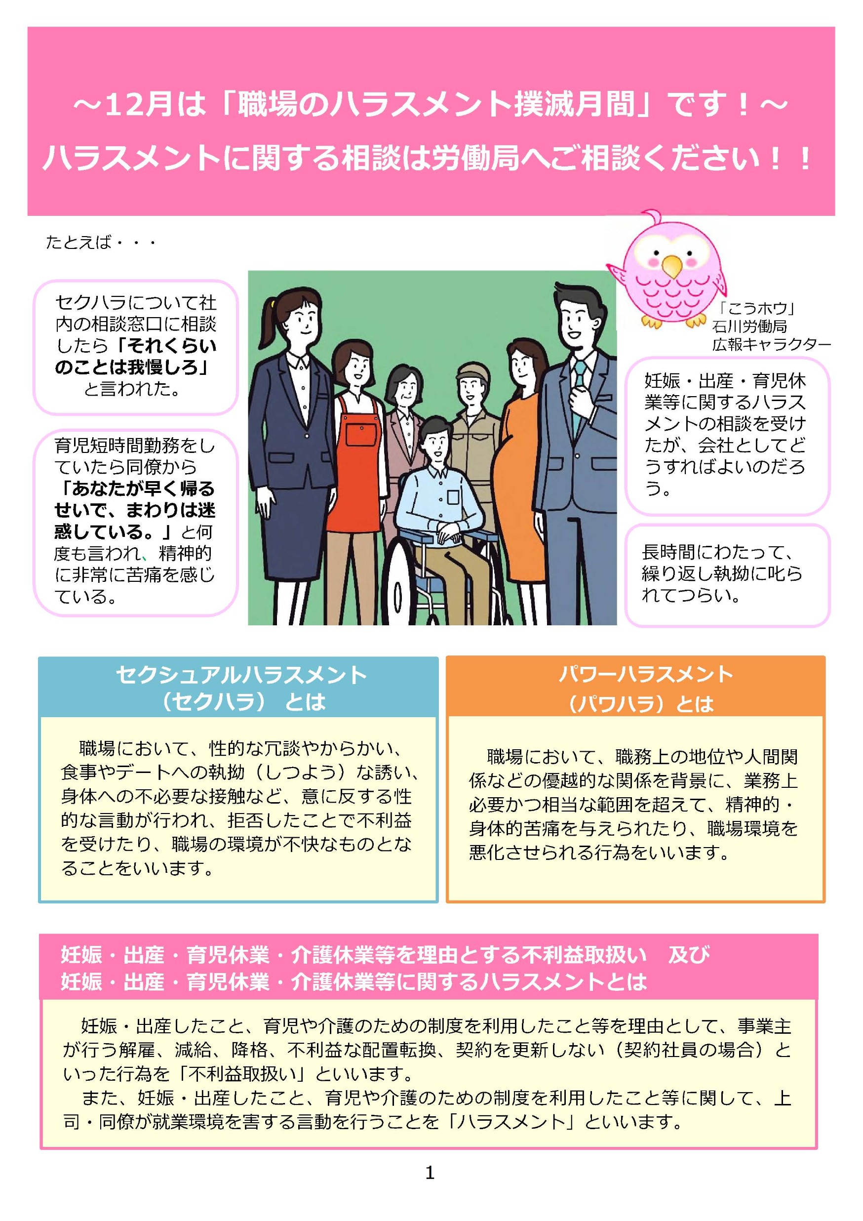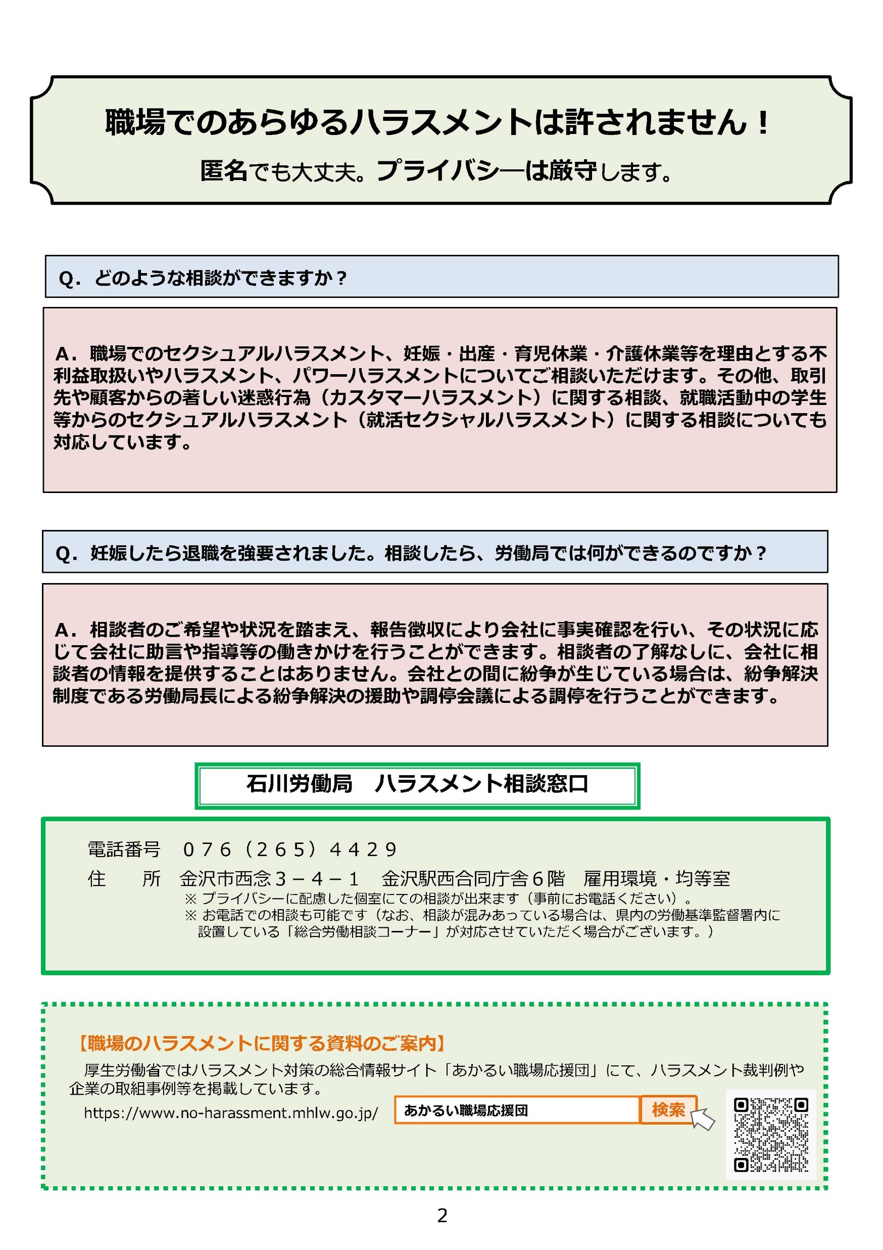 ハラスメントに関する相談は石川労働局にご相談ください。