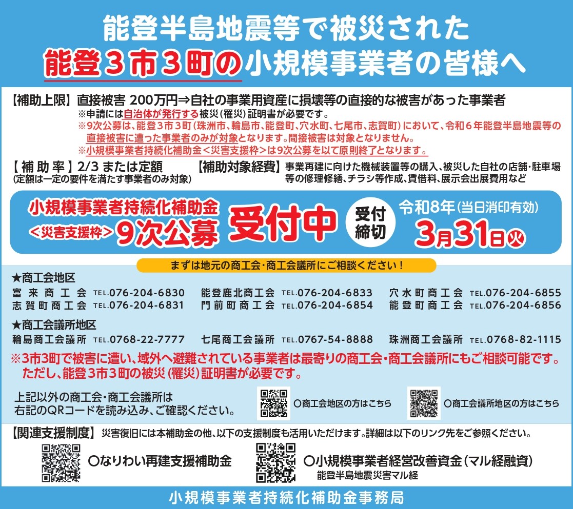 令和6年能登半島地震等で被災された事業者を支援する「持続化補助金(災害支援枠)」の第9次公募が開始されました。