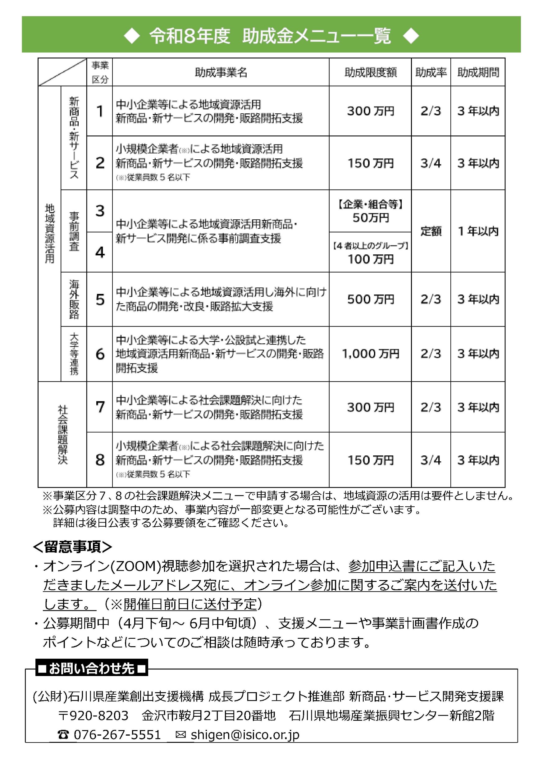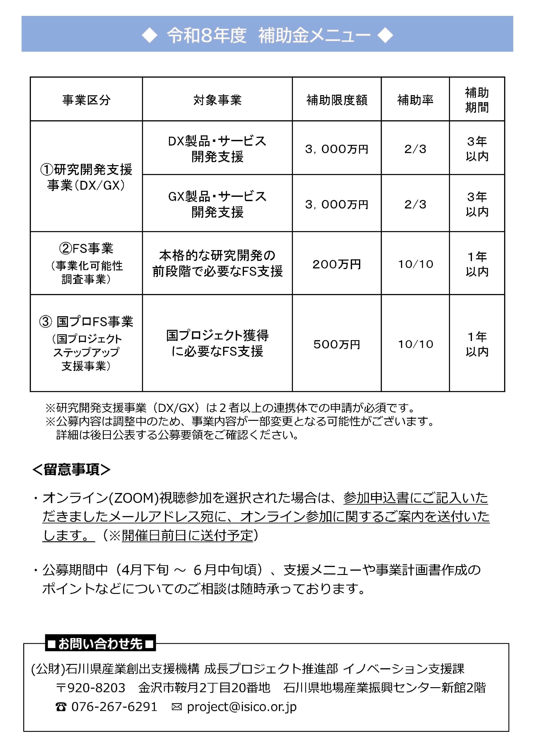 R8年度は下記日程で公募説明会を実施いたしますので、関係者の皆様、研究開発・商品開発等に取り組まれる中小企業者等の皆様へ周知いただき、ご活用いただけましたら幸いです。