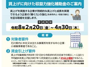 【石川県商工会連合会】 石川県賃上げに向けた収益力強化補助金の公募が開始されました